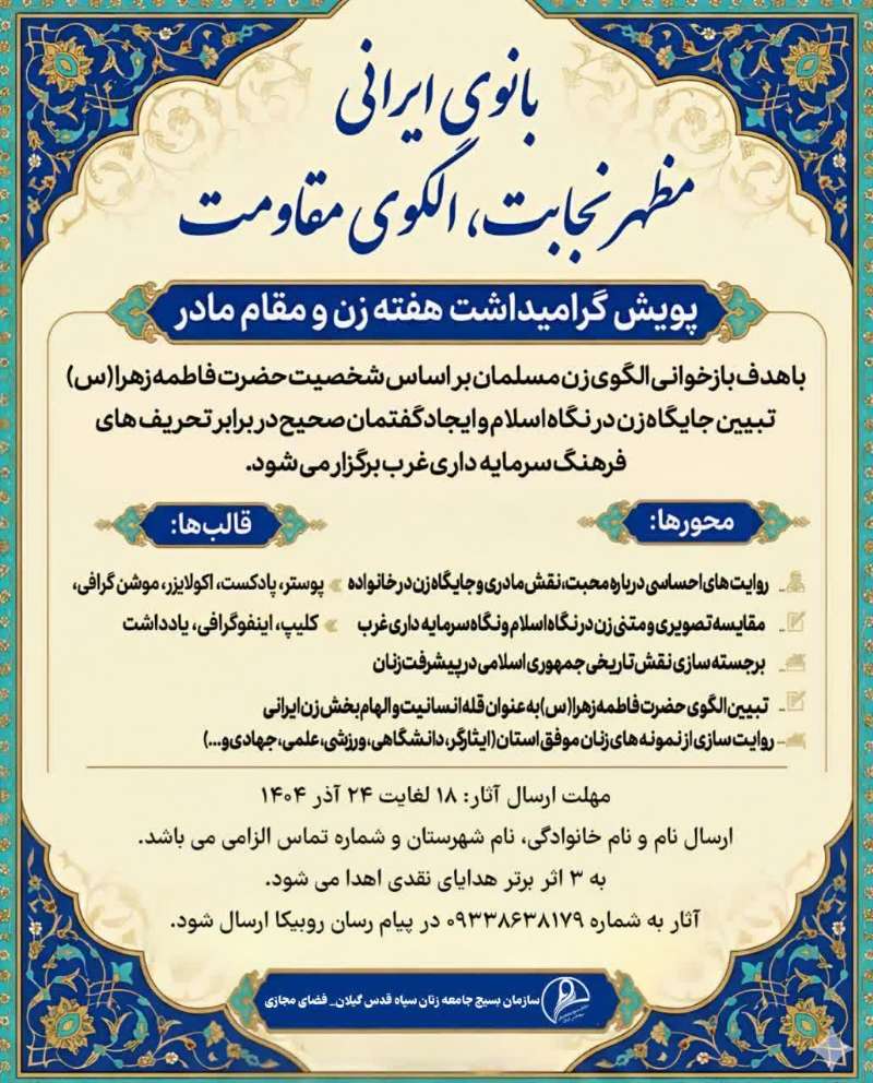 رئیس سازمان بسیج جامعه زنان سپاه قدس گیلان با اشاره به ضرورت بازخوانی الگوی زن مسلمان بر اساس شخصیت حضرت فاطمه زهرا (س) گفت: با هدف تبیین جایگاه زن در نگاه اسلام و مقابله با تحریفهای فرهنگ غرب پویش« بانوی ایرانی، مظهر نجابت، الگوی مقاومت» برگزار می شود.