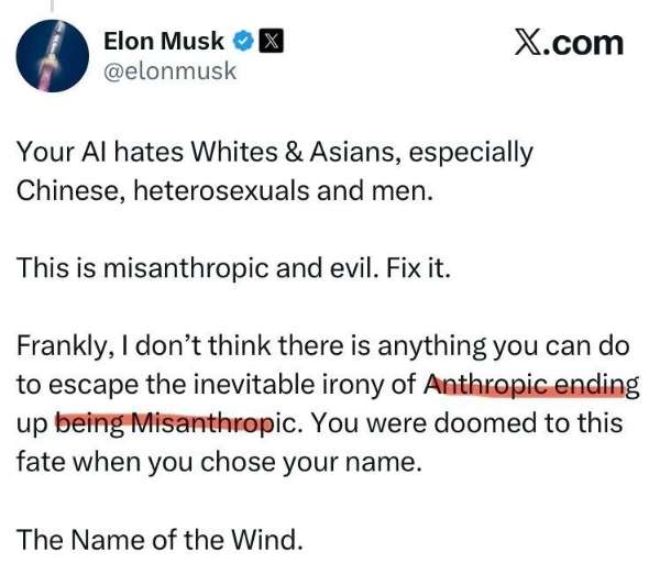 به گزارش خبرگزاری زنان ایران - ایلان ماسک که صاحب شرکت هوش مصنوعی xAI رقیب آنتروپیک است، مدعی شد که هوش مصنوعی آنتروپیک از سفیدپوستان و آسیاییها، بهویژه چینیها، دگرجنسگراها و مردان متنفر است. او به هیچ نمونه مشخصی اشاره نکرد اما افزود: این ضدانسانی و شیطانی است و باید اصلاح شود. صادقانه بگویم، فکر نمیکنم راهی باشد که از پارادوکس اجتنابناپذیرِ تبدیل شدن آنتروپیک به نهادی ضدانسانی فرار کرد. وقتی نام خود (آنتروپیک به معنای انسانمحور) را انتخاب میکردید، عملا محکوم به این سرنوشت بودید.